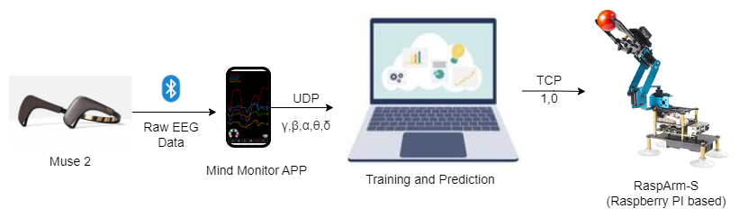 - Hardware: Muse 2 EEG headband, Raspberry Pi-based robotic arm