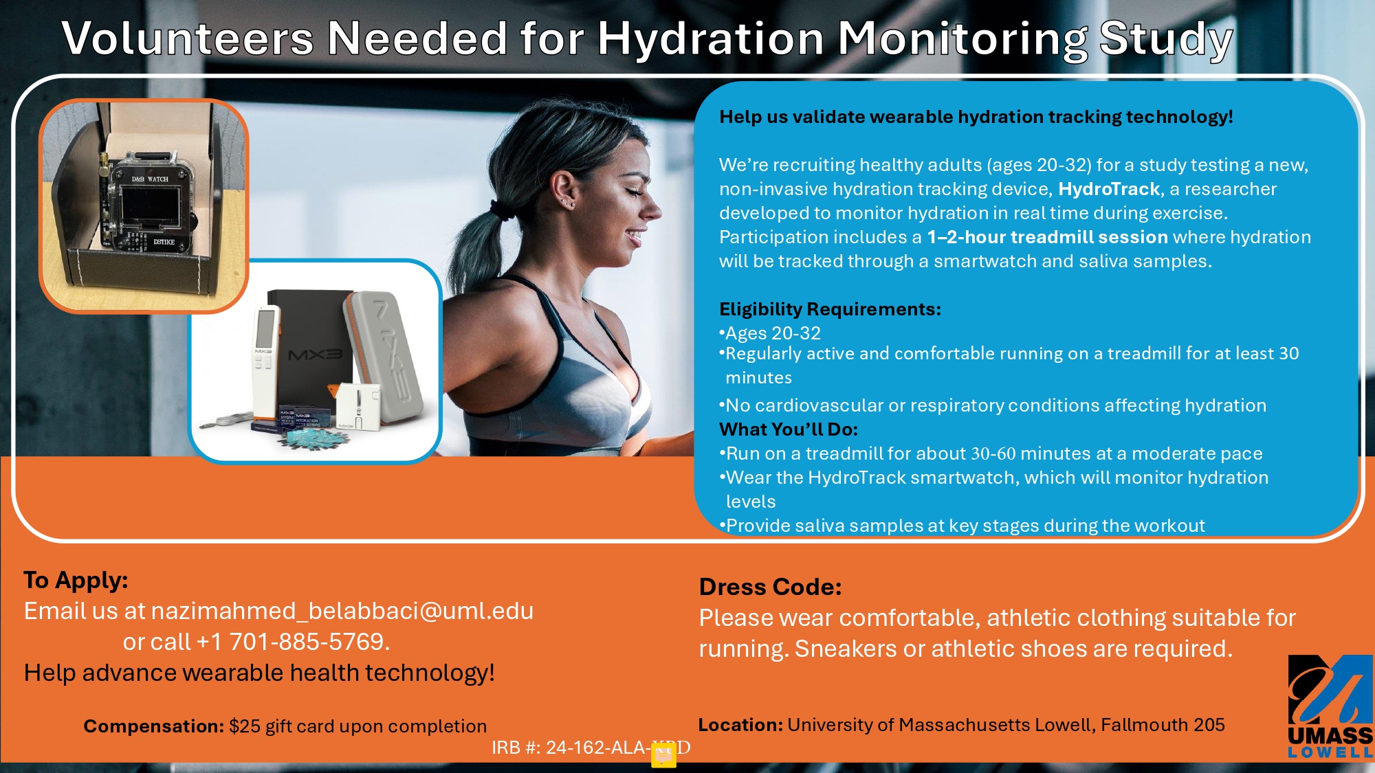 I am currently leading an IRB-approved study at UMass Lowell to validate the next-generation HydroTrack device during treadmill exercise.